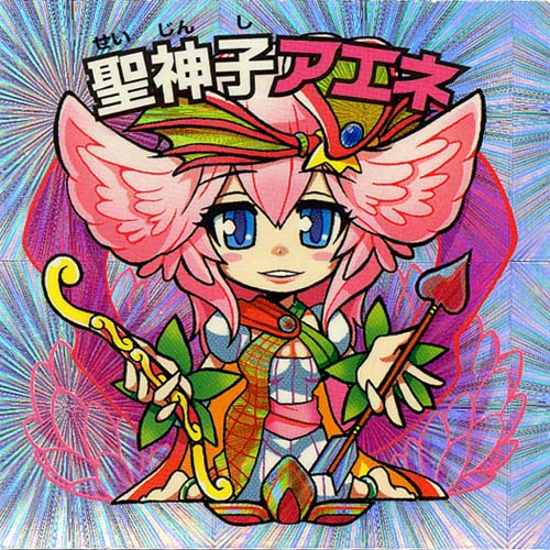 今日のおとぎ~ 今回のメインヘッドの一人。 ナディアとメディアのルーツ? 髪型もそうだけど、手にした弓と矢は若き日の聖神 ナディアBWのものとソックリ。 同じく髪飾りがメディアBWのものと似ている。 後に超聖神にもて遊ばれる二人のルーツだとすると 今回の婚姻阻止っていうストーリーも感慨深いものになってきます。 悲恋を運命付けられた神々の一族として。 あ、あくまで個人の妄想ですので、ホントはもっと違うストーリーがあるのかも? お相手のシールも早く引き当てたいですな^^